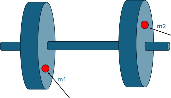 上記で考えますと、偏重心m1 m2があり、それは半径r1 r2の距離にあり、m1=m2 r1=r2である場合は、これは静的にはバランスしています。